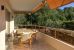 The bright and spacious living area—combining a lounge, dining room, and office (or potential third bedroom)—opens onto a generous, private terrace of over 30 m². This outdoor space provides partial sea views and stunning vistas of the lush, green hills.