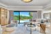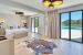 Séjour lumineux et spacieux avec de grandes baies vitrées offrant une vue directe sur la mer et le jardin.